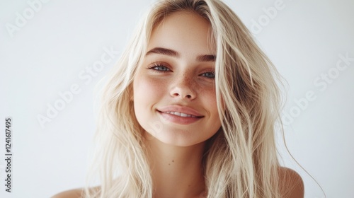 Smiling young woman with long blonde hair and freckles, radiating joy against a soft white background, capturing a moment of happiness and beauty.