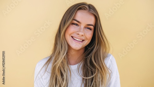 Smiling Young Woman with Long Hair Against Yellow Background. A cheerful young woman with long, flowing hair smiles brightly, radiating positivity against a vibrant yellow backdrop.