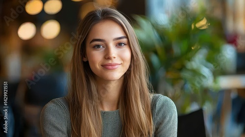Smiling young woman with long hair in a cozy cafe setting, exuding warmth and charm.