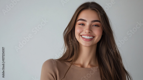 Smiling young woman with long hair, wearing beige top, exuding warmth and confidence in neutral background. Her joyful expression brightens scene, creating positive atmosphere