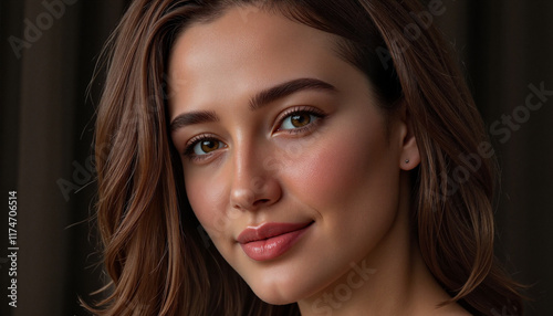 Smiling young woman with natural makeup, warm indoor setting, confidence