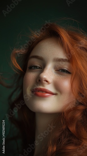 Smiling young woman with red hair in elegant lighting against a dark green backdrop showcasing close-up artistry