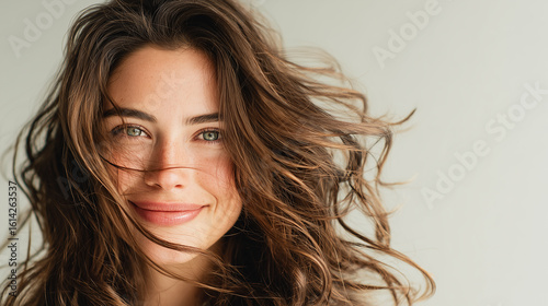 Smiling Young Woman with Wind-Blown Wavy Brown Hair Against Light Background