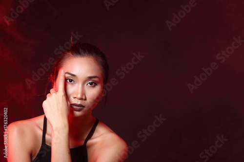 Smoke Tan Skin Asian Woman black hair dark lip with Dense Fluffy Puffs of White Smoke and Fog on dark Background