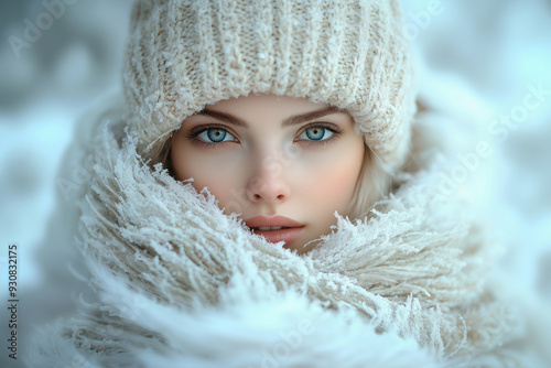 Snow Maiden, Snegurochka or Winter queen , white winter forest background. Woman in white. Happy New Year, Merry Christmas, x-mas Holiday.