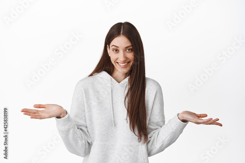 So what, I have nothing. Smiling unbothered girl smiling with cunning sly look, spread hands sideways and shrugging careless, dont care, feel relaxed, no worries, standing against white background