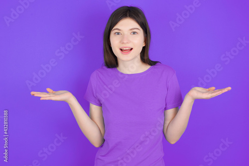 So what? Portrait of arrogant young beautiful Caucasian woman wearing purple T-shirt over purple wall shrugging hands sideways smiling gasping indifferent, telling something obvious.