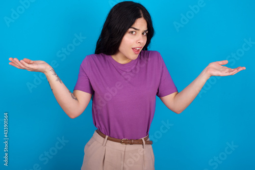 So what? Portrait of arrogant young beautiful tattooed girl wearing purple t-shirt standing against blue background shrugging hands sideways smiling gasping indifferent, telling something obvious.