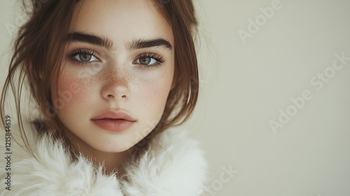 Soft light illuminates a young woman peacefully gazing forward a subtle neutral color palette enhances her serene expression. AI Generated