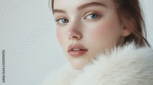 Soft light illuminates youthful face framed by fluffy white fur. AI Generated