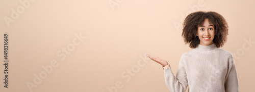 Something special and advice from student. Portrait of cheerful young african american female in sweater holds on hand blank space, isolated on yellow background, cut out, studio shot
