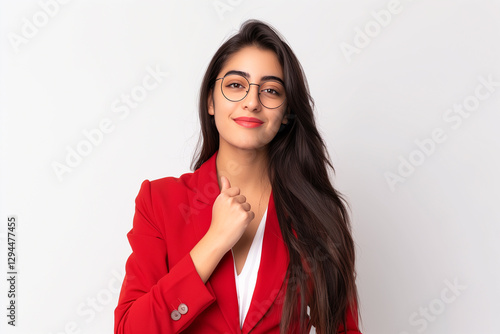 South Asian female CEO confidently gestures with fist to chest in professional attire on white background