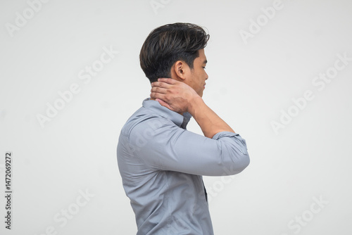 Southeast Asian man viewed from the side, holding the back of his neck in a gesture of muscle pain or stiffness. Isolated on a light background.