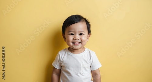 southeast asian toddler boy yellow background wearing plain white tshirt smiling happy portrait