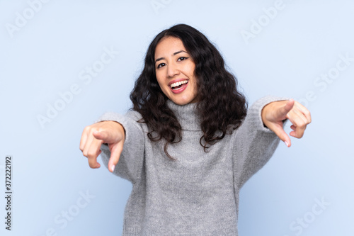 Spanish Chinese woman over isolated blue background points finger at you while smiling