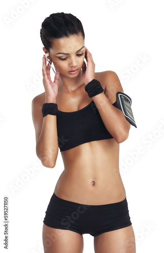 Sports, girl listening to music with phone and earphones for workout podcast, motivation and focus in gym. Health, exercise and fitness model with audio app isolated on transparent, png background.