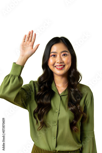 standing Beauty Asian woman with open mouth near raising one hand saying good news , or greeting isolated on transparent background, PNG file format.
