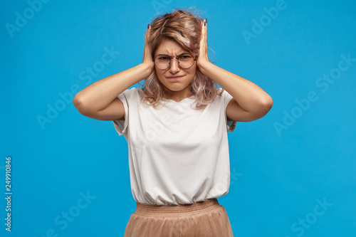 Stop it! Horizontal studio image of frustrated attractive fashionable hipster girl having fight with her jealous boyfriend, can't stand intolerable loud screams, covering her ears, having annoyed look