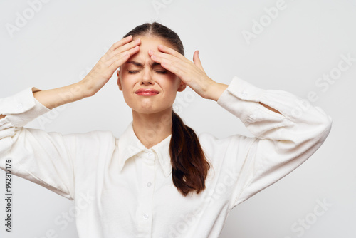 Stress, frustration, headache, young woman, emotional distress, white background, casual clothing, hands on forehead, anxiety, negative emotions