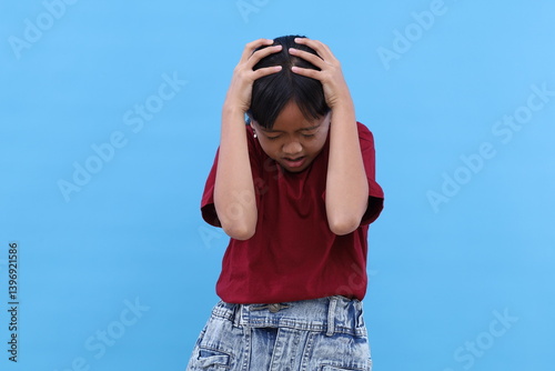 Stressed asian little girl standing while holding her head. She suffering from headache