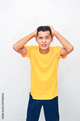 Stressed Asian man with a worried expression holding his head in disbelief