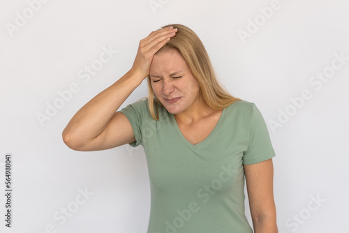 Stressed young woman with hand on forehead. Portrait of frustrated Caucasian female model with fair hair in green T-shirt with closed eyes realizing mistake. Regret, stress, headache concept