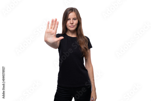 Strict young woman with straight hair shows a gesture of disagreement and stop