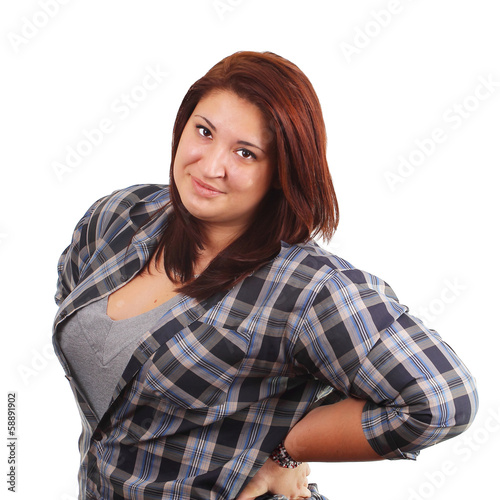 Strong girl dressed in plaid shirt on white