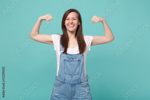Strong smiling young brunette woman girl in casual denim clothes posing isolated on blue turquoise background studio portrait. People lifestyle concept. Mock up copy space. Showing biceps, muscles.