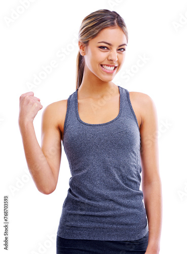 Studio, athlete and portrait of woman, fist and celebrate to workout for fitness, health and wellness. White background, adult and female person with care for sports, exercise and muscle for girl