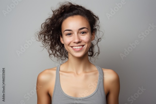 studio beauty portrait of a smiling confident woman in tank top with down syndrome on gray background