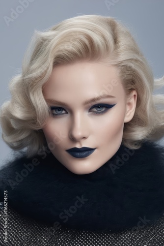 Studio beauty shot of young blonde woman. Fashion hairstyle and trendy makeup.