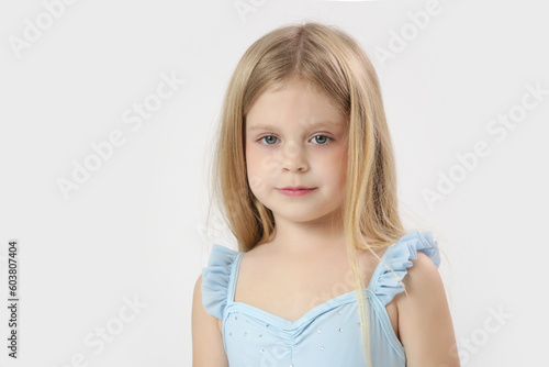 Studio headshot of beautiful 5 years old girl with blue eyes and long blonde hair