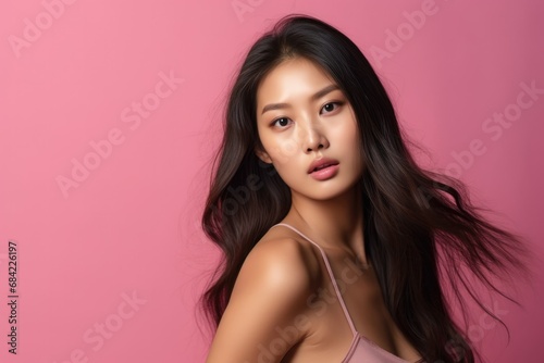 Studio photo of Asia female Model photography, in clear pink background, Generative ai