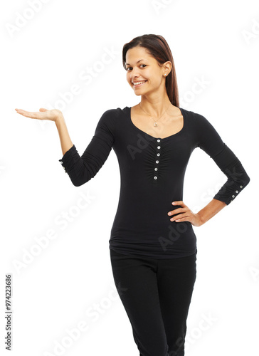 Studio, portrait and businesswoman with hand for promotion, decision and choice for sales offer. Mockup space, female person and pride with gesture for announcement, advertising and white background