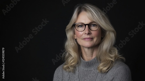 Studio portrait of 50-year-old mature white woman with long blond hair wearing a cozy grey sweater and glasses smiling against black background