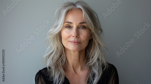 studio portrait of a beautiful middle-aged Caucasian woman with long blond hair looking at the camera. White background