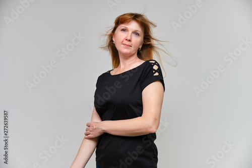 Studio portrait of a beautiful pretty woman aged 40 years on a white background, smiling, showing different emotions, happy with life. In a black sweater with red hair. Directly opposite the camera.