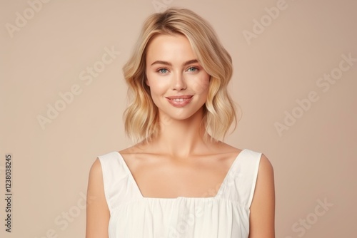 Studio portrait of a beautiful young woman with blonde hair, wearing a white top, smiling on a beige background