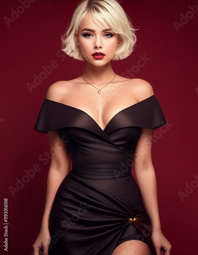 studio portrait of a blonde female model with short hair wearing a low cut black dress on red background, fashion photography
