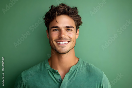 Studio portrait of a cheerful young man wearing a green shirt, smiling against a green background