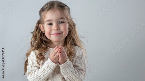 Studio Portrait Of A Little Girl On A White Background, Making A Heart Gesture With Her Hands