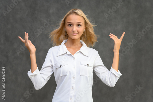 Studio portrait of a pretty blonde student girl, young woman in a white shirt on a gray background. Talking, showing emotions.