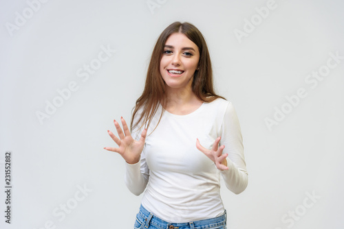 Studio portrait of a smiling happy beautiful brunette girl on white background.