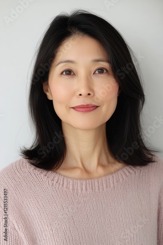 Studio portrait of a smiling middle-aged asian woman with dark hair wearing a pink sweater against a plain background