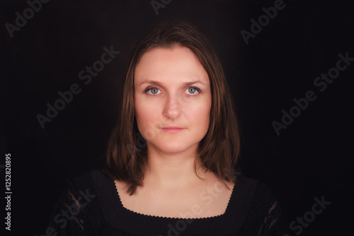 Studio portrait of a woman with brown hair wearing a black dress on a dark background. Professional headshot photography for design and print.