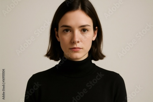 Studio portrait of a young woman wearing a black turtleneck sweater, showcasing minimalist fashion and a confident gaze
