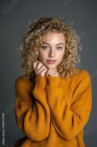 Studio portrait of a young woman with curly blonde hair, wearing a yellow sweater and holding her hands together