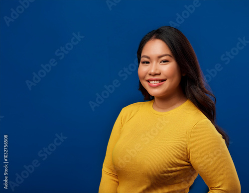 Studio Portrait of Beautiful Happy Young Woman Smiling Against Blue Studio Background Confidently