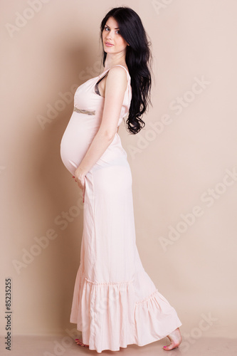 Studio portrait of beautiful pregnant woman holding her belly